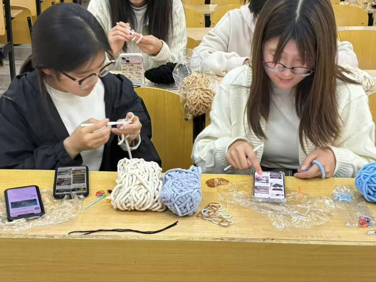 活动伊始,同学们一起观看编织耳机包的教学视频,共同学习编织的方法与要领,大家钻研针织技巧,彼此交流分享心得,从起针开始一步步学习,研究针法,琢磨收针。面对鲜少接触的领域,大家不怕错误,专注学习,最终编织出一个个由同学们的智慧与努力凝结而成的小小的耳机包。