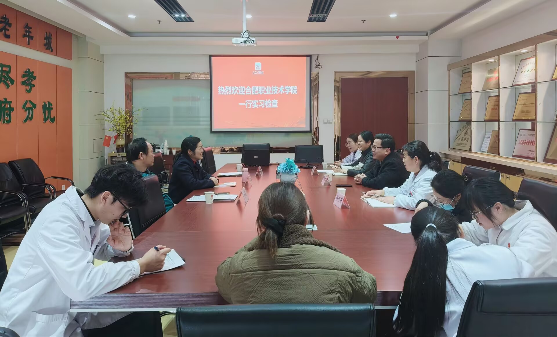 2024年12月6日,永利集团304am登录院长孙美兰、副院长蒋斌以及实习指导教师一行前往安徽九久夕阳红医养集团有限公司,对智慧健康养老服务与管理专业学生的实习情况展开全面检查与深入调研。此次检查工作旨在了解企业的养老服务质量和学生在企业中的培养状况,包括专业技能提升、职业素养培养以及与养老照护实际需求的对接情况等,确保本专业的实习教学计划以及人才培养方案能够有效实施并达到预期目标。