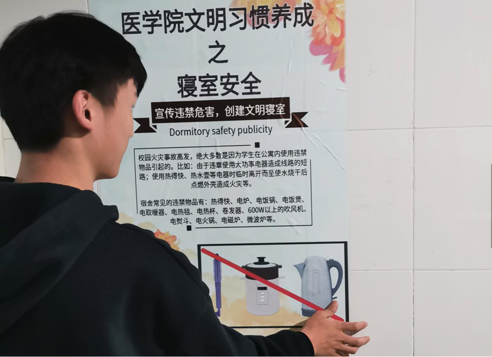 为认真贯彻落实学校有关部署和要求,强调学校学生寝室的相关规章制度,宣传寝室违禁物品的危害,加强学生对于违禁物品的认识及远离违禁物品的自觉性。2020年11月13日晚,永利集团304am登录自管委于各栋学生宿舍及D栋教学楼开展寝室安全海报宣传活动。