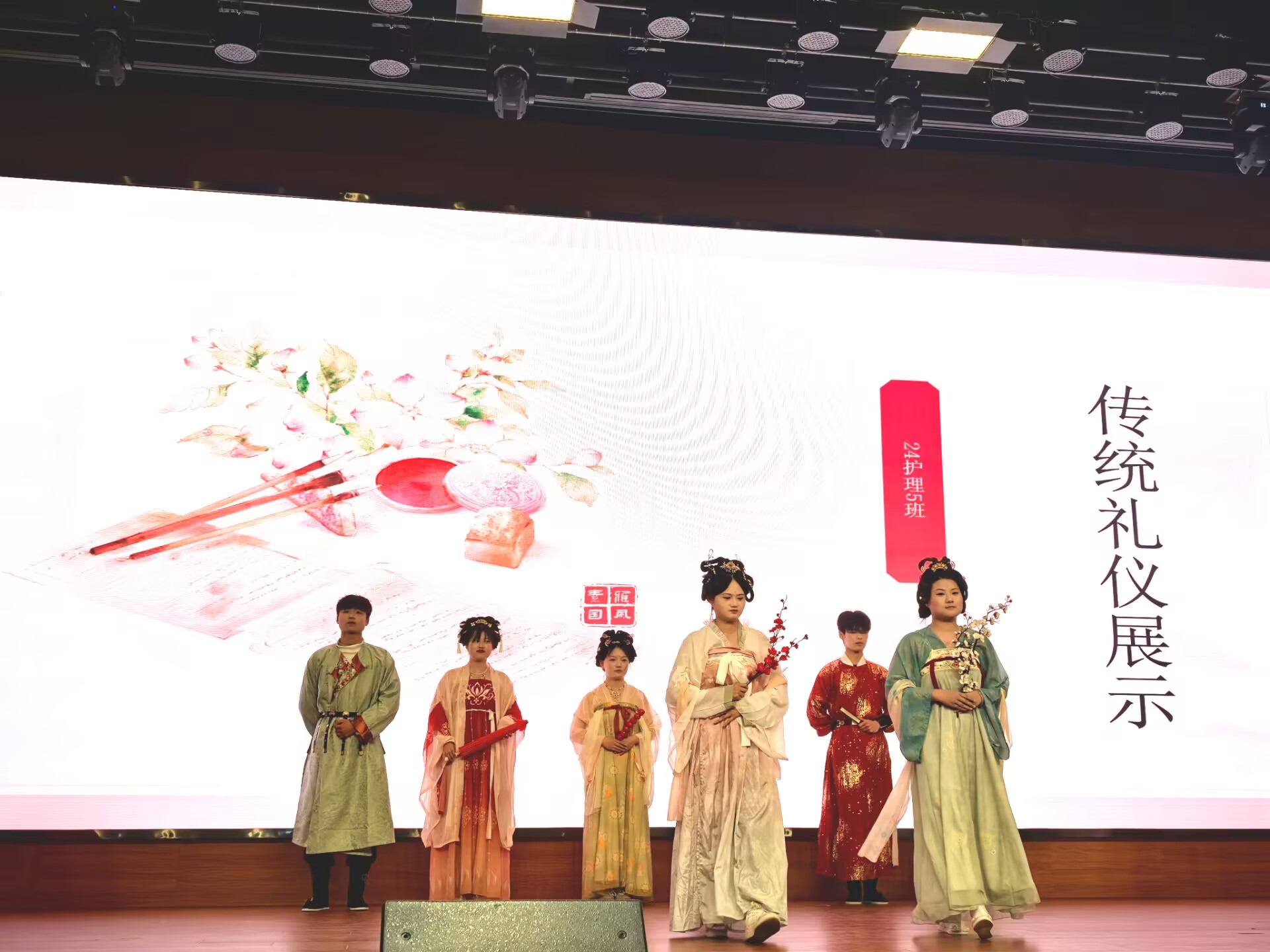经过激烈初赛,共有14支队伍脱颖而出进入决赛。比赛分为职业礼仪、传统礼仪和社交礼仪三个组别。职业礼仪组通过情景模拟,生动展现了医护人员的规范着装、优雅仪态和专业服务用语;传统礼仪组选手们身着中华传统服饰,以优雅仪态和经典礼仪,再现了中华传统礼仪的文化底蕴;社交礼仪组则聚焦现代社交场景,展示了大学生的得体举止和沟通技巧。