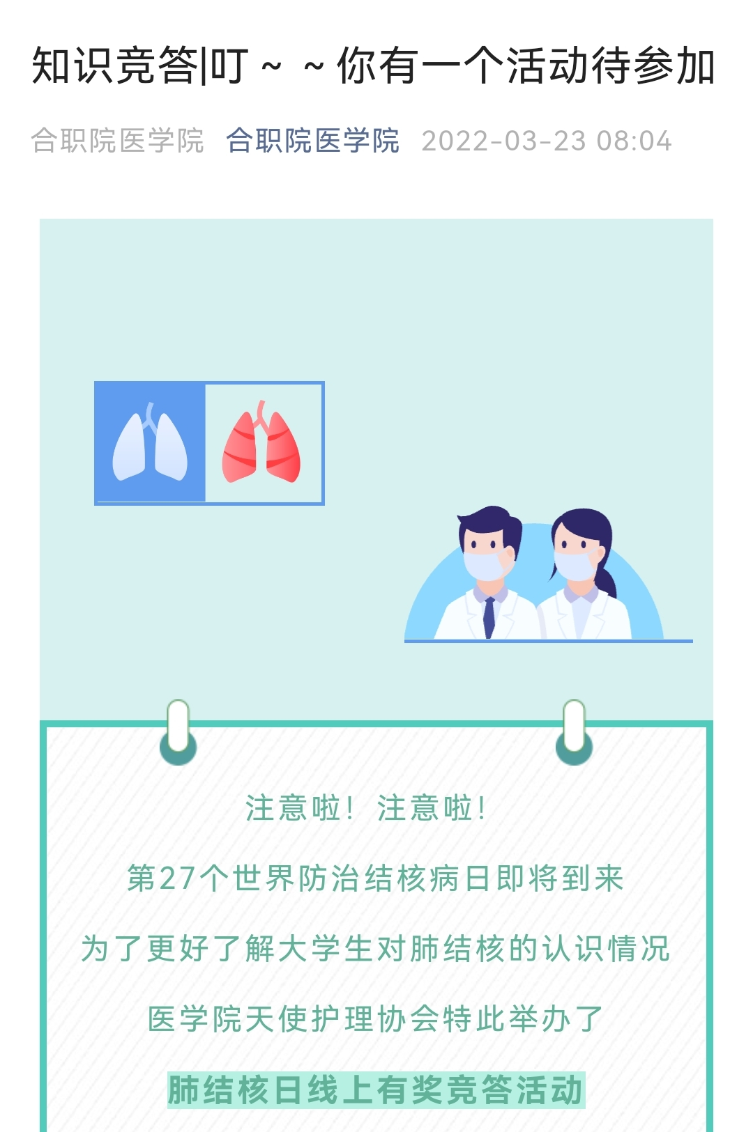 为宣传结核病有关知识,加深大学生对肺结核的了解,提高大学生面对结核病的自我防护意识,在第27个“世界防治结核病日”来临之际,永利集团304am登录天使护理协会开展了以“携手抗疫防痨 守护健康呼吸”为主题的线上知识竞答活动,以此加强对防治结核病的宣传,呼吁大家积极与结核病危机作斗争。