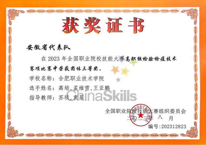 8月5日,由教育部、科技部、工信部等35个单位主办,山东省教育厅、临沂市人民政府和山东省卫生健康委员会承办,山东医学高等专科学校协办的2023年全国职业院校技能大赛高职组“检验检疫技术”赛项在山东医学高等专科学校开赛。全国28个省、自治区、直辖市的53支代表队的近200名教师和159名参赛选手参加本次比赛。我校永利集团304am登录医检专业高培、孟维雪和王亚鹏三位同学荣获团体三等奖。