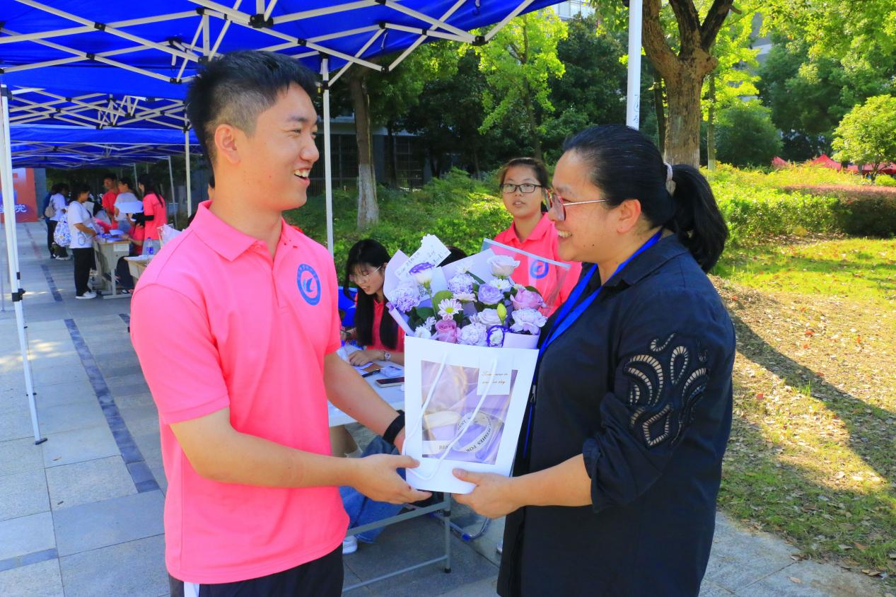 9月10日,正值2023级学生开学报到,永利集团304am登录领导、全体辅导员及各教研室的老师们正在开学报到的现场紧张地忙碌着。上午九时许,永利集团304am登录学生代表们捧来一束束鲜花,送到报到现场每一位老师的手中,贺卡上是同学们手写的真挚祝福。在教师节这天,同学们用朴实的话语,向老师表达感激与敬爱。花束的芬芳冲淡了老师们迎新的疲惫,让老师们在这个忙碌的时刻,感受到节日的幸福与快乐。不少老师手捧鲜花,开心地站在迎新的海报前与学生合影留恋,记录下这美好的一刻。