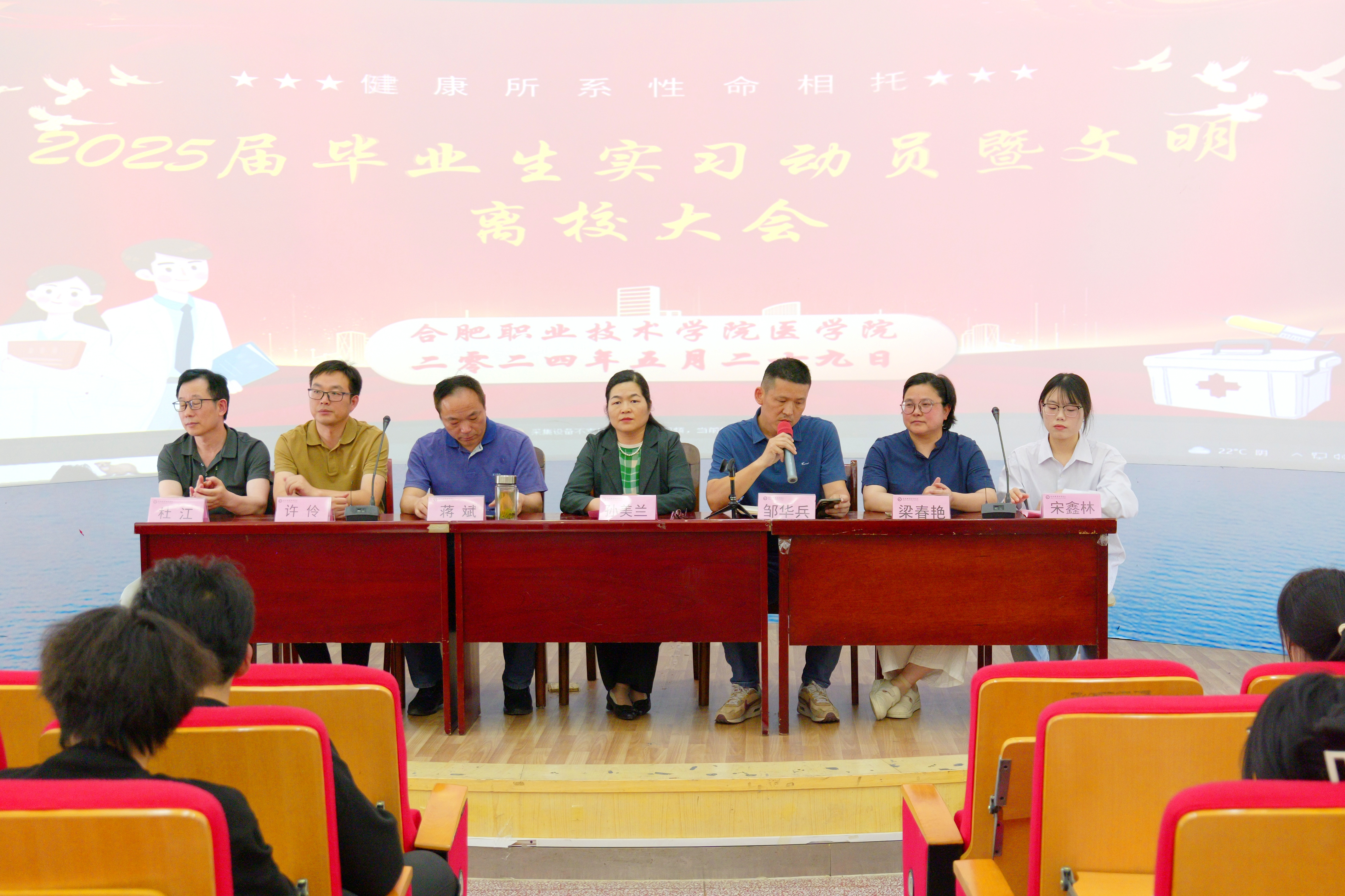 大会伊始,永利集团304am登录副院长蒋斌发表了实习动员讲话。他殷切期望同学们在实习期间能够展现敬业精神,持续关爱患者;强化团队合作意识,在医疗团队中相互支持、共同进步;保持自我提升的动力,不断反思学习,提升专业素养。紧接着,来自22医检1班的宋鑫林同学作为实习生代表发言,她表达了珍惜实习机会、为母校争光的决心。