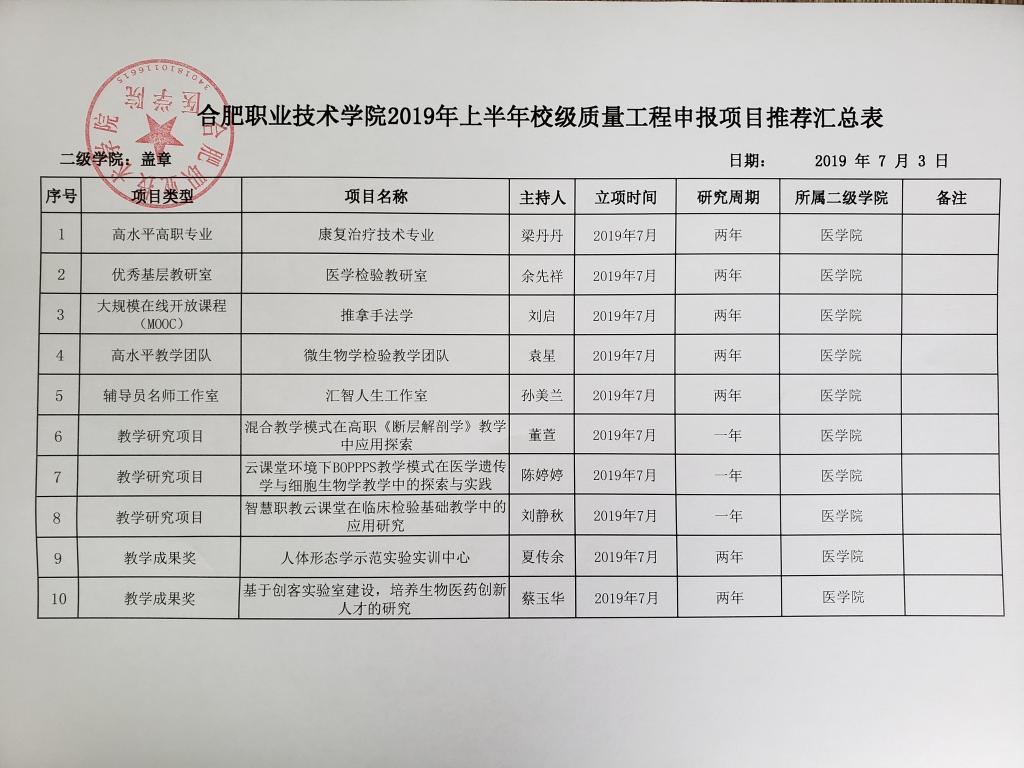 按照校质量工程管理办法,永利集团304am登录于2019年7月2日召开质量工程申报项目评审会,现给予以下项目推荐申报,公示时间4天,截止至2019年7月6日公示结束,如有异议请与永利集团304am登录教学管理办公室吕小明联系,电话055182394900。