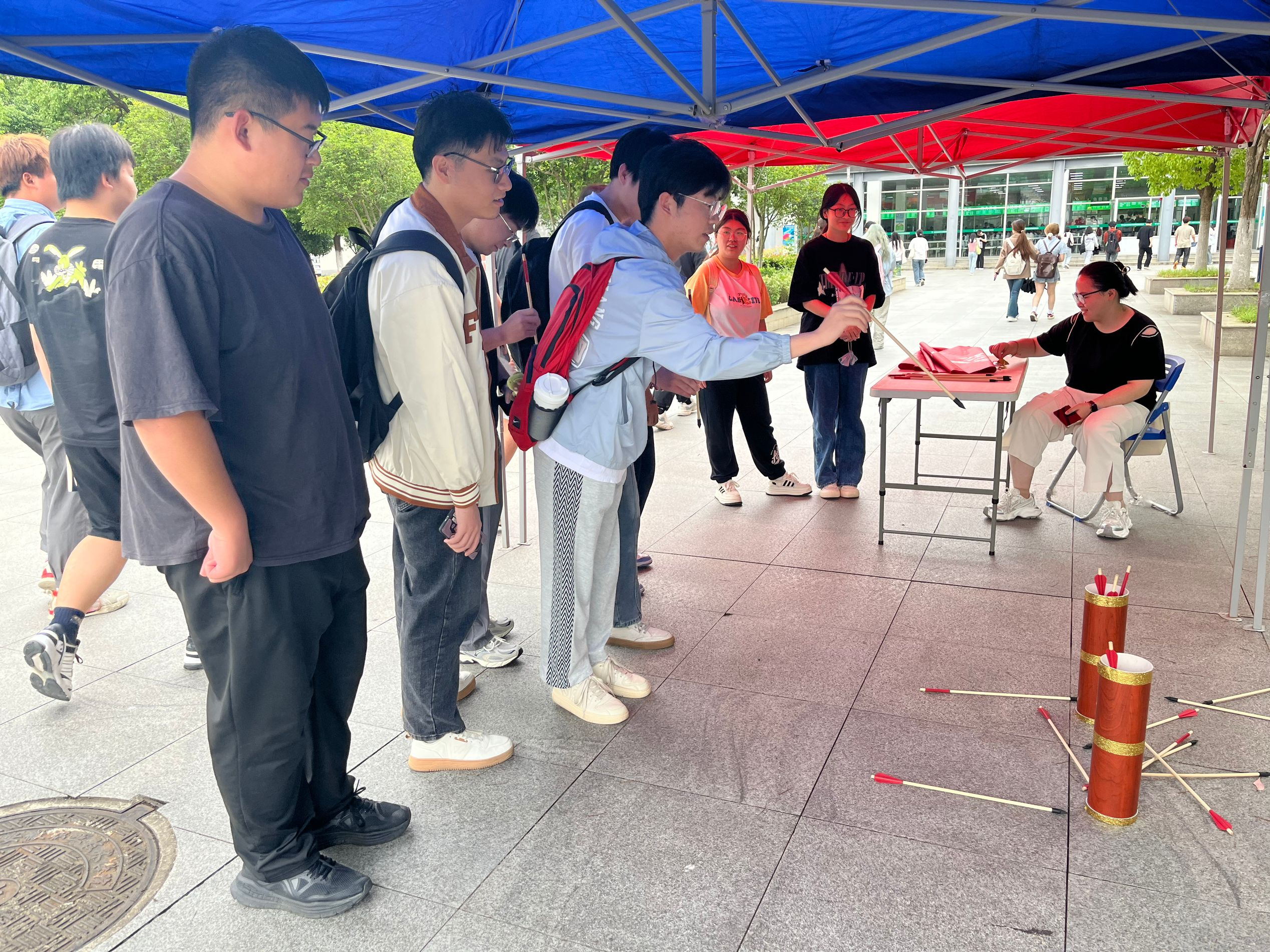粽叶飘香迎端午,投中壶中相思情。舒窈职业礼仪社“趣味投壶”活动在一食堂对面吸引大量学生的热情参与和围观。同学们踊跃参加,积极尝试,现场氛围欢欣热烈。参与的同学激情澎湃,喝彩声回荡在整个场地。社团还为参与投壶的同学准备了五彩绳作为奖品,生动展示了我国传统文化习俗,营造了浓厚的端午节氛围。