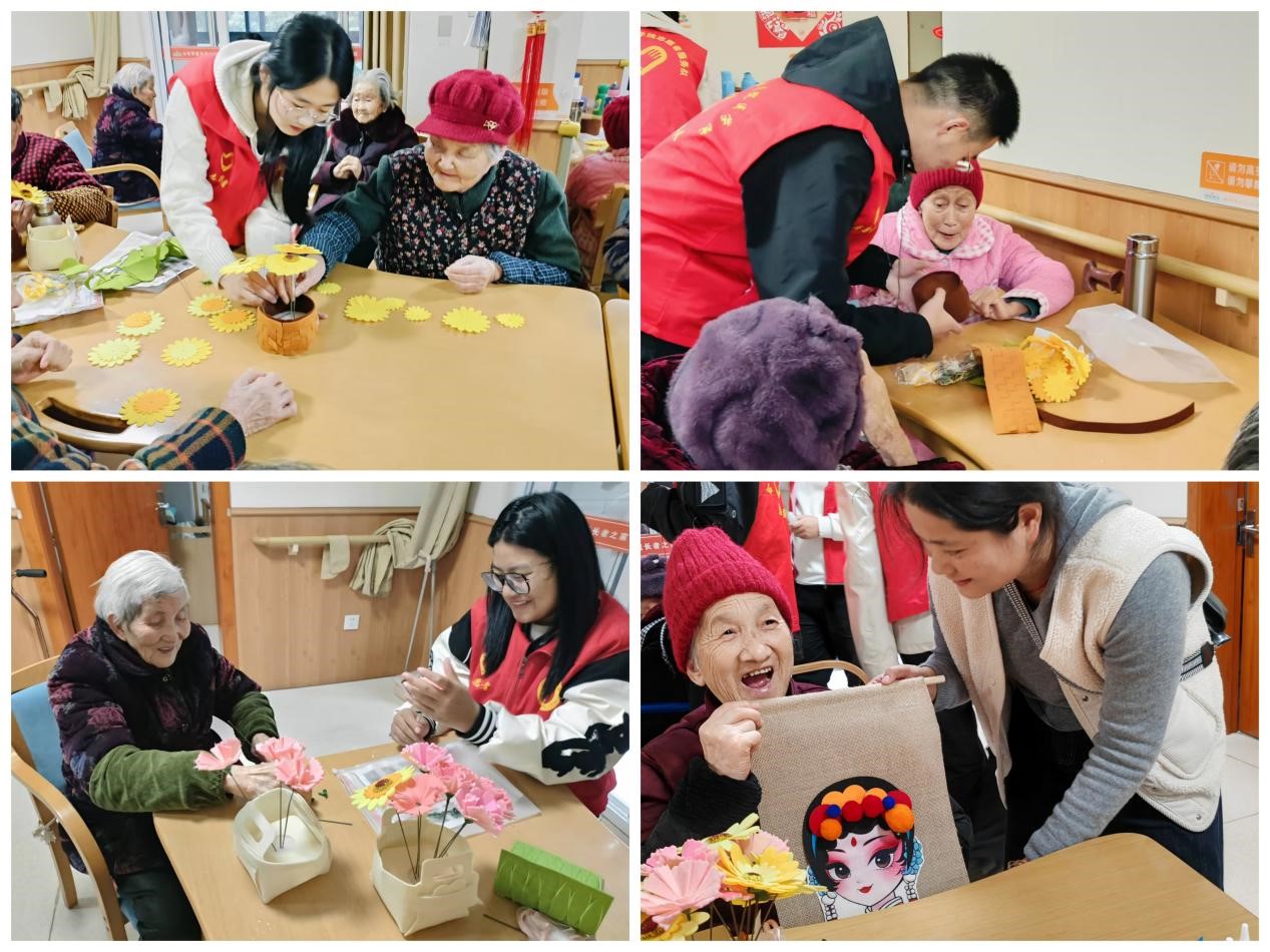 有的小组用彩纸折叠出五彩斑斓的花朵,制作出了实用的装饰摆件;有的小组则在布料黏贴京剧脸谱装饰挂件。整个过程中,老人们的脸上洋溢着开心的笑容,党员志愿者们也耐心地指导着每一位老人,确保他们能够顺利完成自己的作品。