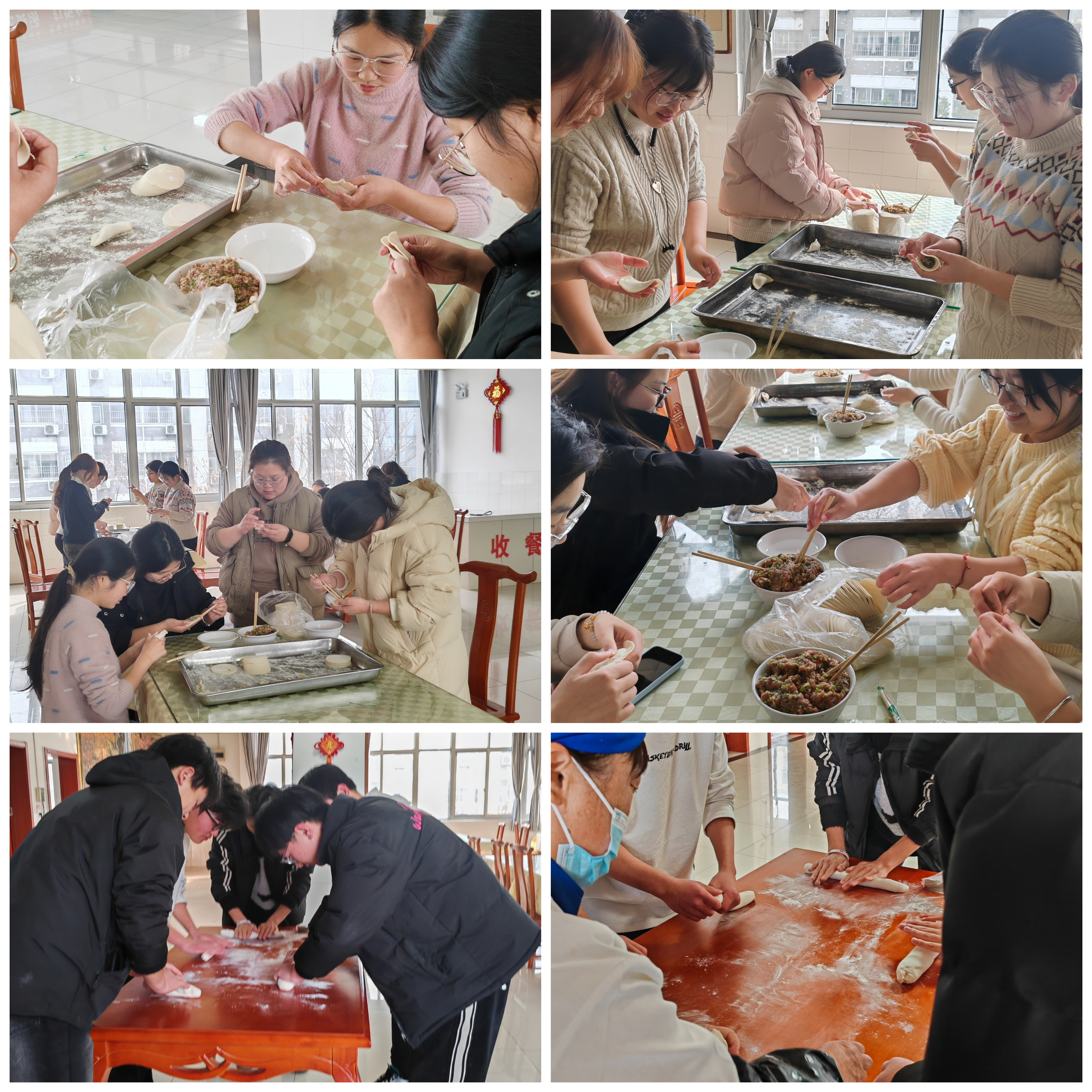 准备阶段 在开始包饺子之前,所有同学必须用洗手液和清水彻底洗手,采用七步洗手法,至少洗手20秒,确保手部清洁。提前准备好饺子皮、馅料(如猪肉、韭菜、鸡蛋等)以及包饺子所需的工具(如擀面杖、案板等)。邀请食堂大师傅进行现场示范,教授学生如何包饺子。