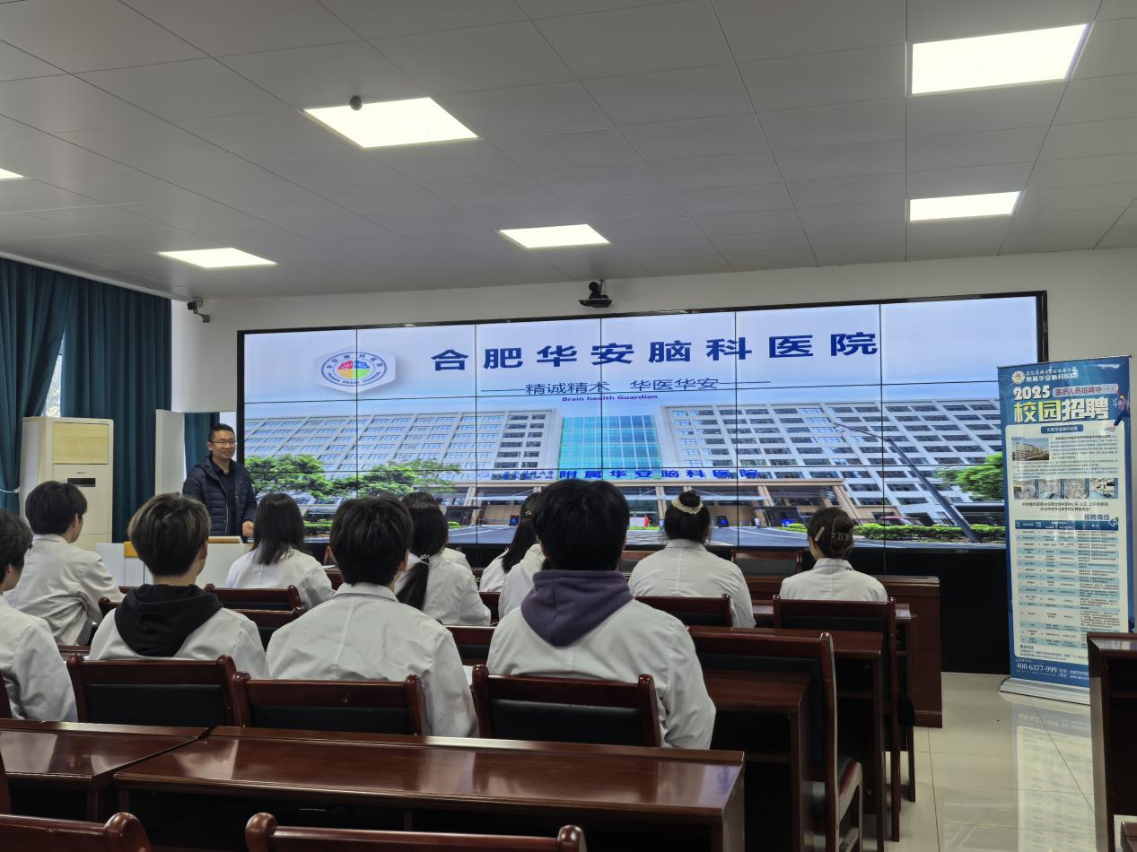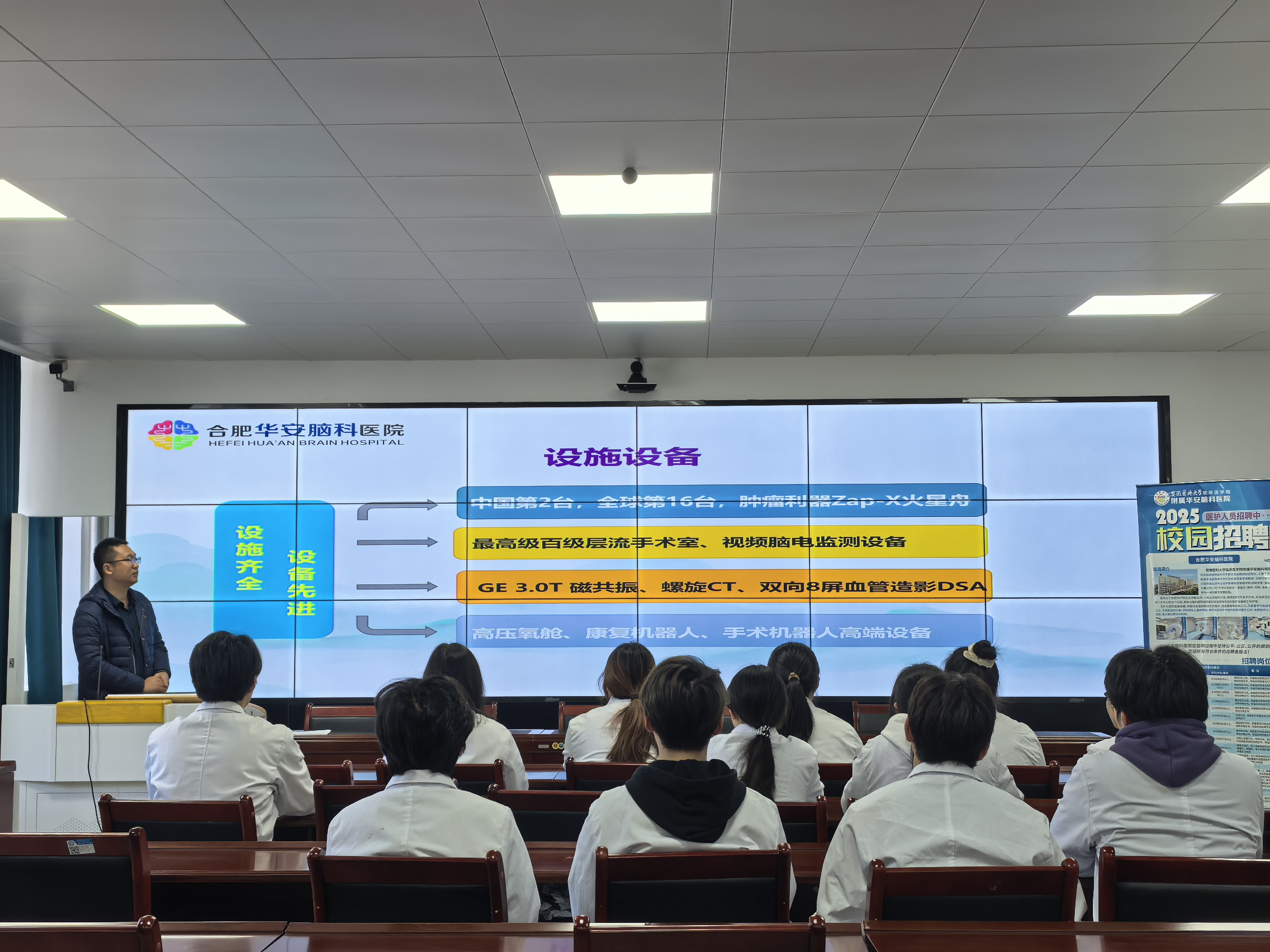 座谈会后,合肥华安脑科医院康复科主任张毅通过就业宣讲会向同学们详细介绍了医院的规模、企业文化、医疗技术、设施设备、人才培养以及未来发展规划,并热情解答了同学们关于职业发展、晋升空间等方面的问题。